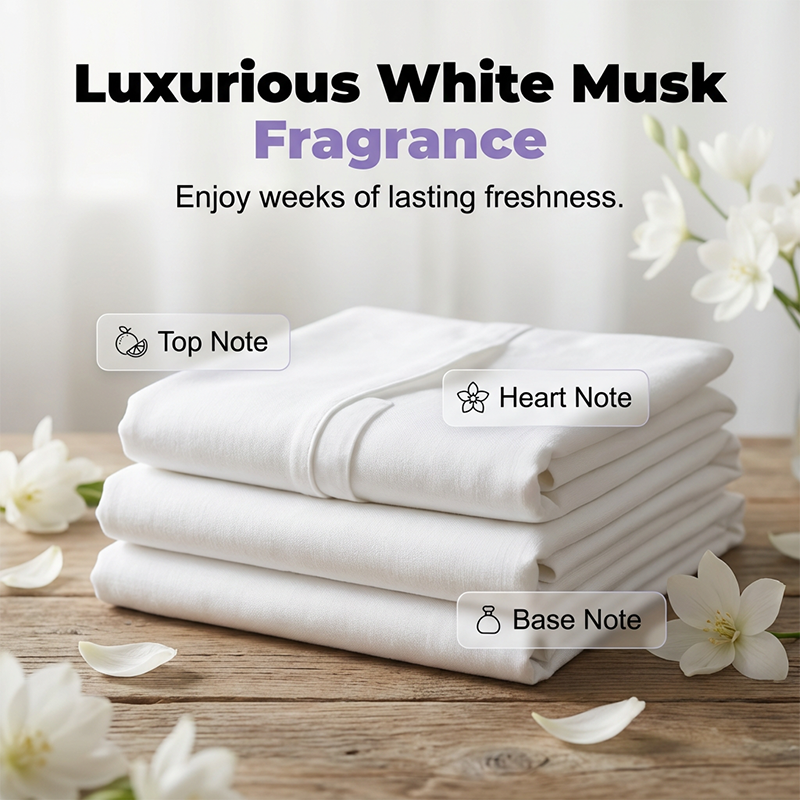 LUXUSNÍ VŮŇ BÍLÉ MUŠKY - Naše kapsule na prádlo impregnované kvalitními vůněmi olejů zanechávají na prádle elegantní vůni bílé mušky s trvalou čerstvou vůní, která vydrží týdny.